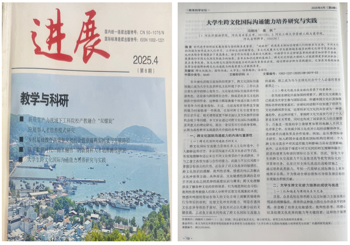 她以第一作者身份发表学术论文5篇。其中,发表于《进展》期刊的论文 ——《大学生跨文化国际沟通能力培养研究与实践》,研究聚焦全球化时代的人才培养痛点,核心是解决 “大学生如何在多元文化环境中高效沟通、提升竞争力” 的问题。通过理论梳理与实践调研,构建了跨文化沟通能力的培养框架,既注重学术严谨性,又强调教学落地性,最终形成了可复制、可推广的培养方案。