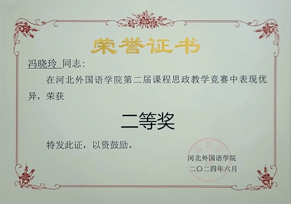 另外,冯晓玲老师积极参加各类比赛,2024年在校级第二届课程思政教学竞赛中获得二等奖。
