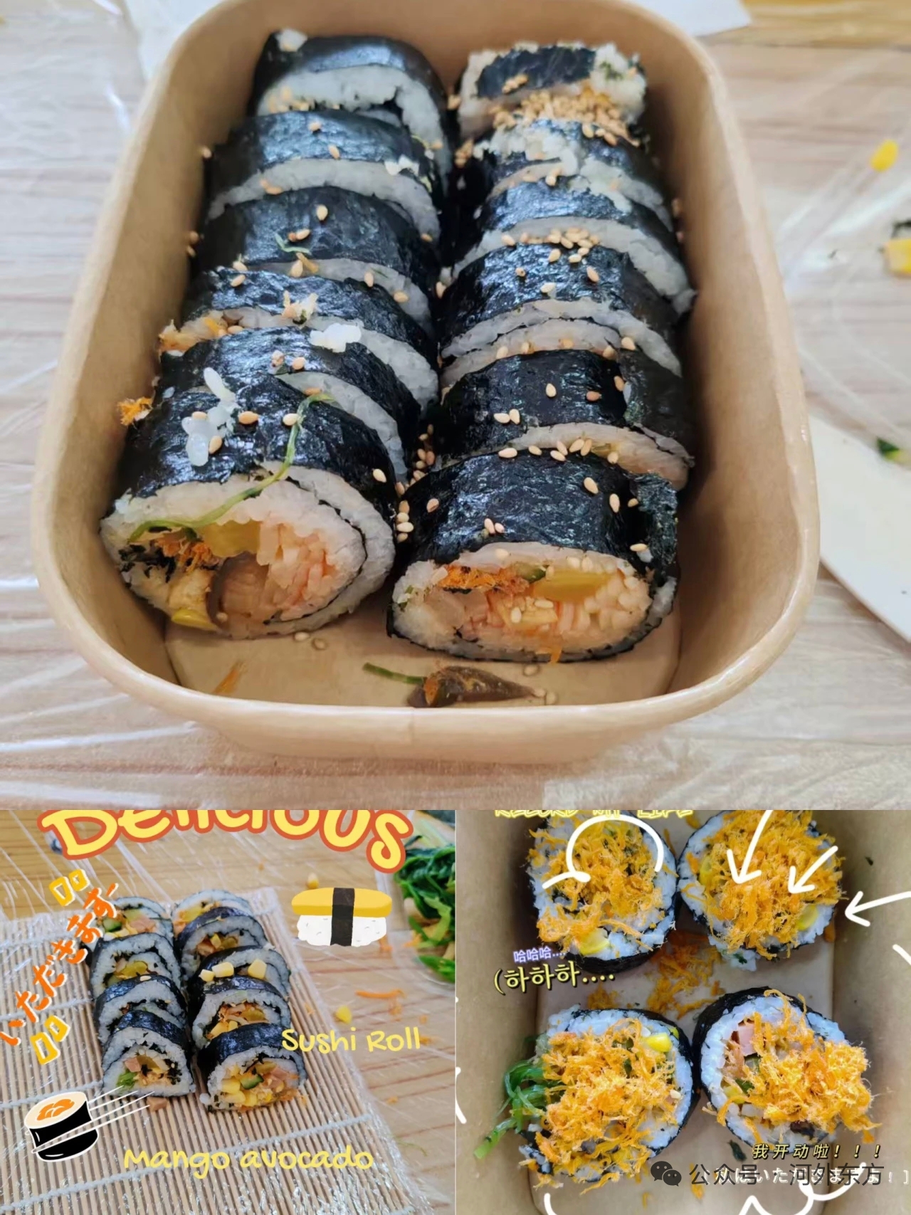 实操环节中,学生以4人小组为单位分工协作,领取紫菜、米饭、黄瓜、火腿等食材及卷帘、刀具等工具,有条不紊地投入制作。过程中,老师巡回指导,耐心解决学生遇到的卷散、切裂等问题,并鼓励大家在遵循传统做法的基础上融入创意搭配。各组成员互帮互助、默契配合,从生疏试探到熟练操作,现场洋溢着欢乐的实践氛围。成果展示阶段,造型各异、色彩丰富的紫菜包饭纷纷亮相,各组分享创作思路与制作心得,交流声、赞叹声不绝于耳。最后,学生围坐品尝亲手制作的美食,在味觉享受中深化文化感悟,活动在集体合影留念、共同整理场地的温馨氛围中圆满落幕。
