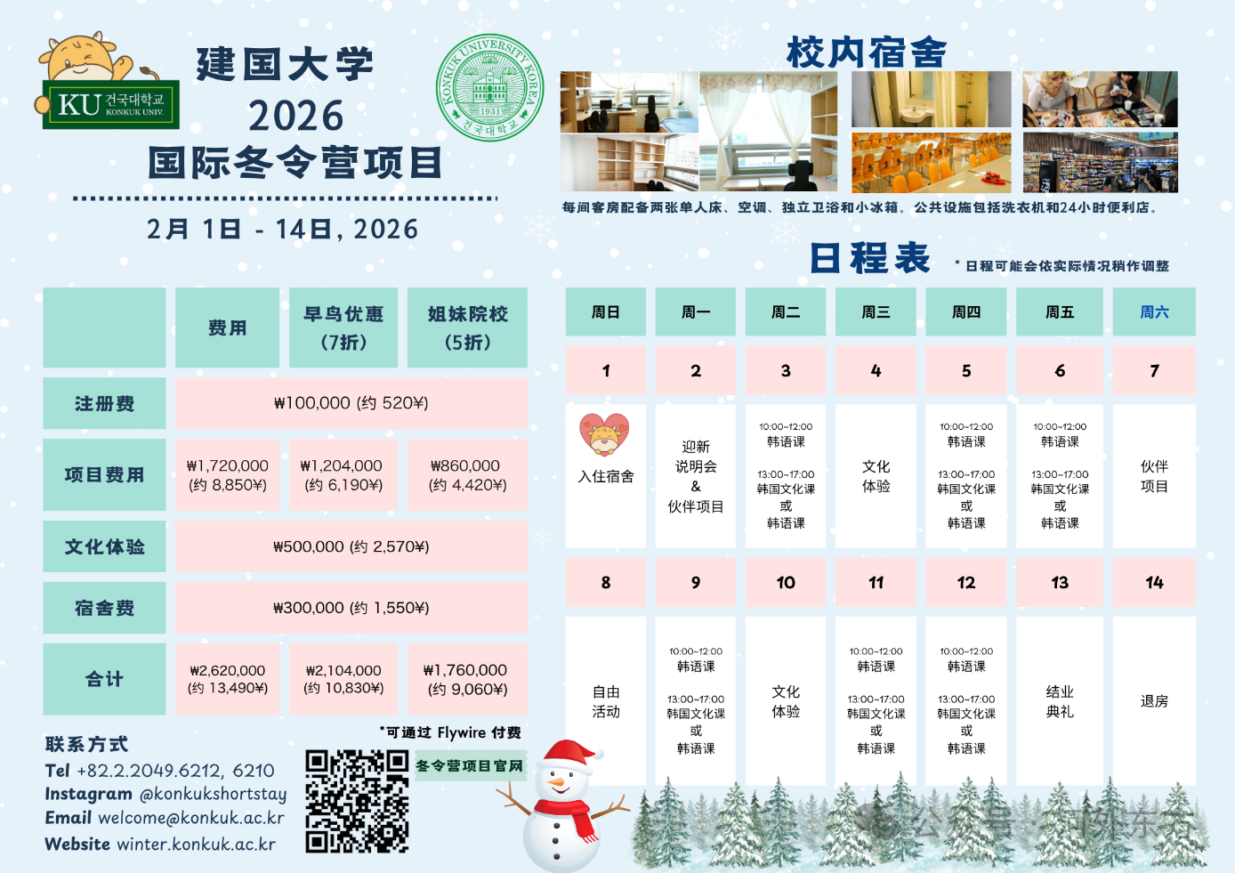 为进一步推动中韩青年学生间的跨文化互动与学术交流,韩国建国大学拟于2026年2月1日-2月14日举办为期2周的寒假短期交流项目。项目期间,参与学生将有机会与韩国建国大学在校生结对交流,沉浸式体验韩国校园文化与大学生活。