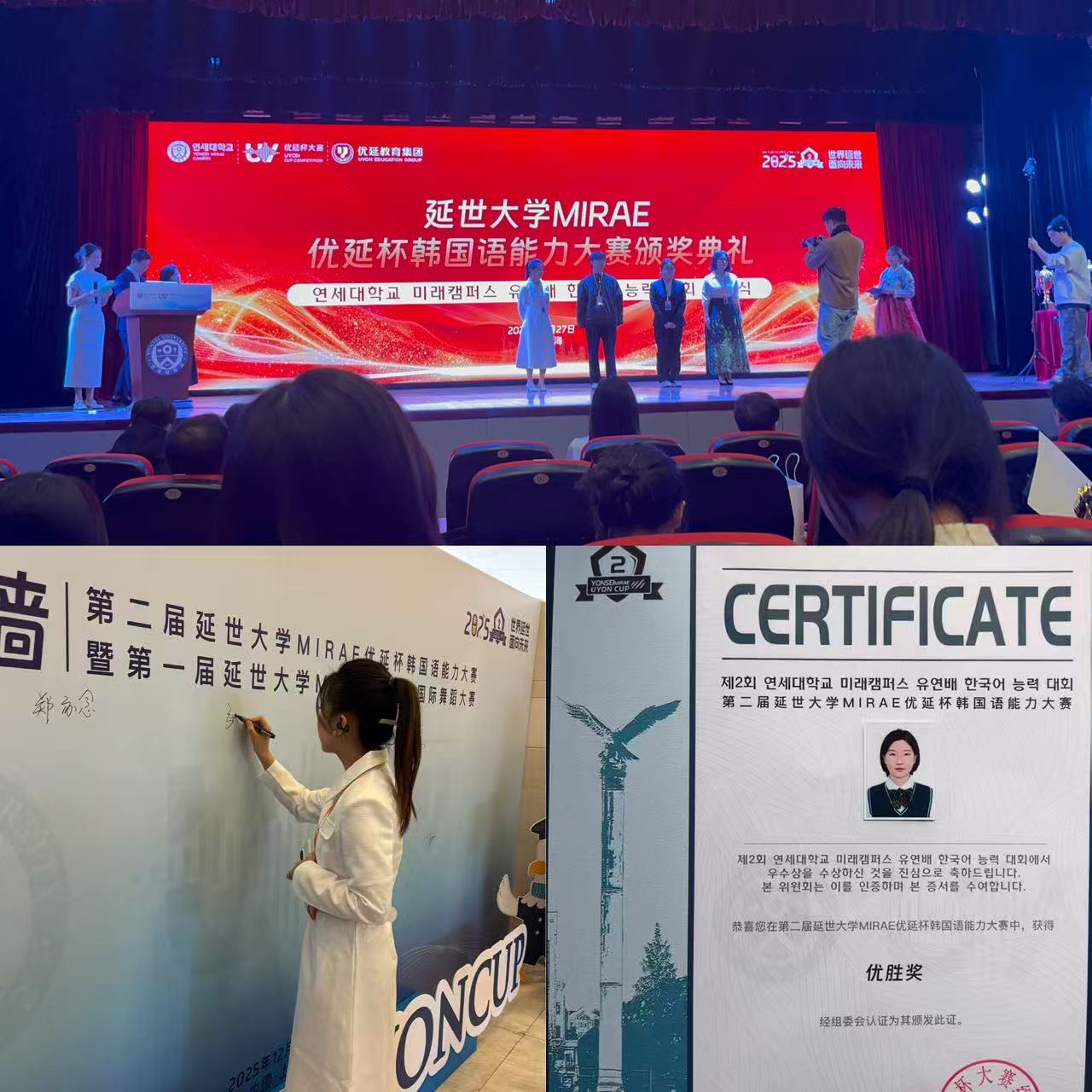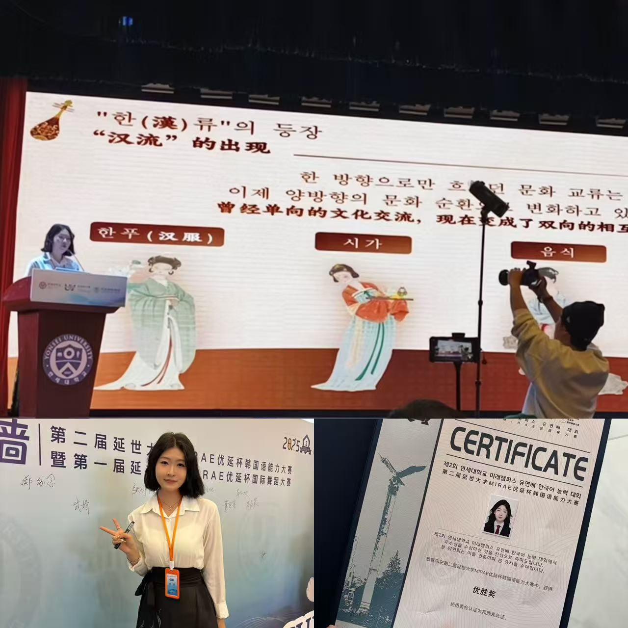 张冰倩同学在韩语能力比拼中凭借扎实的语言功底与深刻的文化理解脱颖而出,她的获奖感言:“站在领奖台上,内心满是难以言喻的情绪。这份荣誉如光,照亮了我在语言迷宫中求索的日夜。回看韩语学习之路,从初遇韩文字母的手足无措,到如今能自如表达思想,每一步都浸着汗水与执着。我曾为细微发音反复推敲,为文化意象冥思苦想。对语言的敬畏让我不敢懈怠,对文化的热爱让我甘之如饴。这个舞台是梦想新起点。我愿以声音为舟,载着对韩语的理解与热爱探索更广阔的世界。这份荣誉属于所有支持者,也激励我继续前行,用语言架起沟通桥梁。衷心感谢老师的悉心指导、同学们的帮助与家人的支持!”